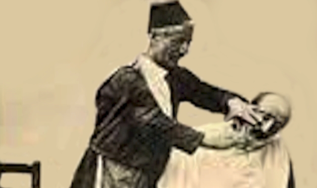Berber dervişin saçlarını kazımaya başlar ve diğer tarafa usturayı vuracakken, mahallenin kabadayısı içeri girer.
