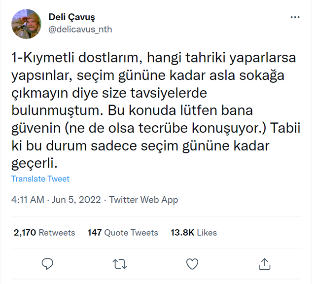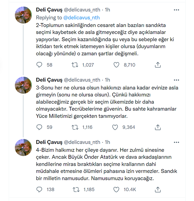Peker, daha önce “hangi tahrikler olursa olsun sokağa” çıkmayın diye uyarıda bulunduğunu hatırlatarak, bu kez “Evinize dönmeyin” dedi. Peker’in, “tecrübe konuşuyor” ve “Duyumlarım var” ifadeleri ise dikkat çekti.Sedat Peker'in yakın adamı olarak bilinen "Deli Çavuş" isimli sosyal medya hesabından paylaştığı tweetler:1-Kıymetli dostlarım, hangi tahriki yaparlarsa yapsınlar, seçim gününe kadar asla sokağa çıkmayın diye size tavsiyelerde bulunmuştum. Bu konuda lütfen bana güvenin (ne de olsa tecrübe konuşuyor.) Tabii ki bu durum sadece seçim gününe kadar geçerli.2-Toplumun sakinliğinden cesaret alan bazıları sandıkta seçimi kaybetsek de asla gitmeyeceğiz diye açıklamalar yapıyorlar. Seçim kazanıldığında şu veya bu sebeple eğer ki iktidarı terk etmek istemeyen kişiler olursa (duyumlarım olacağı yönünde) o zaman şartlar değişmeli.3-Sonu her ne olursa olsun hakkınızı alana kadar evinize asla girmeyin (sonu ne olursa olsun). Çünkü hakkımızı alabileceğimiz gerçek bir seçim ülkemizde bir daha olmayacaktır. Tecrübelerime güvenin. Bu sahte kahramanlar Yüce Milletimizi gerçekten tanımıyorlar.4-Bizim halkımız her çileye dayanır. Her zulmü sinesine çeker. Ancak Büyük Önder Atatürk ve dava arkadaşlarının kendilerine miras bıraktıkları seçime krallarının dahi müdahale etmesine ölümleri pahasına izin vermezler. Sandık bir milletin namusudur. Namusumuzu koruyacağız.